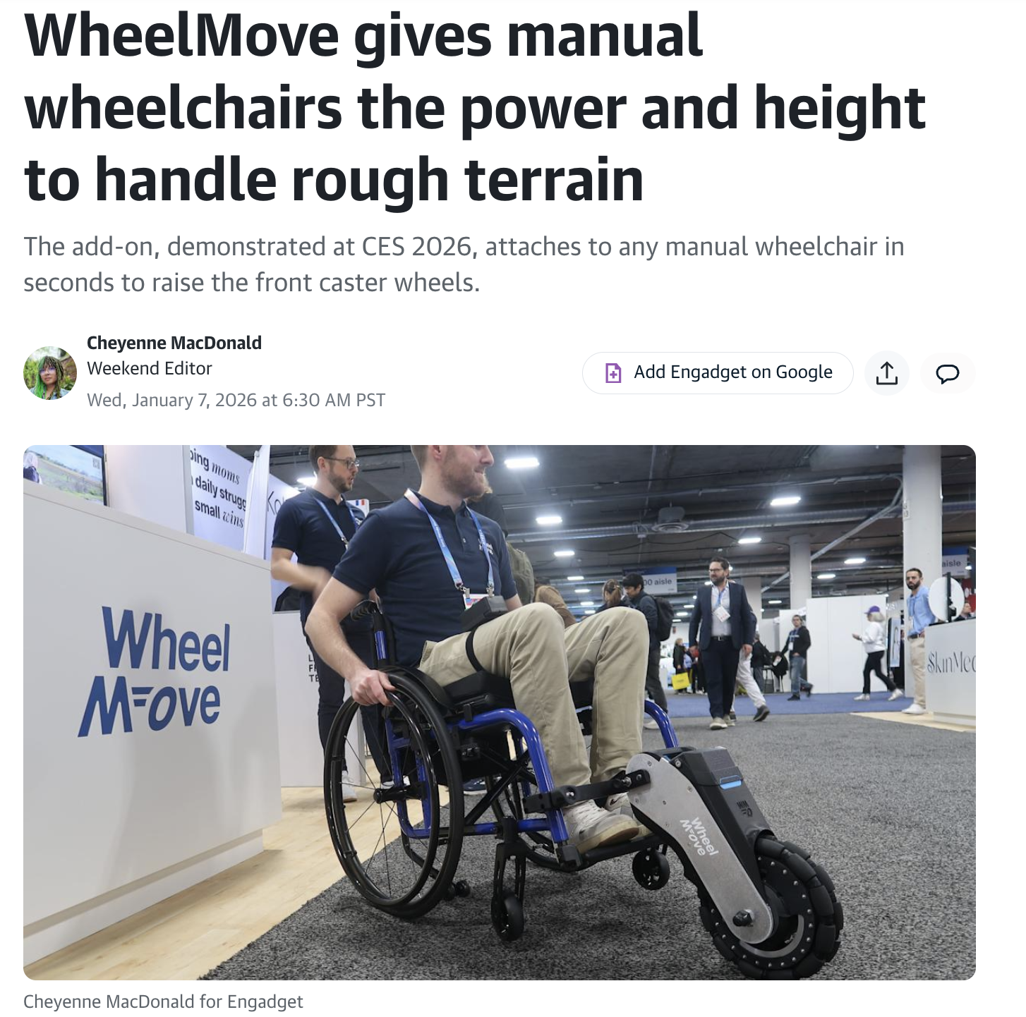 « a compact motorized wheelchair add-on at CES 2026 that not only acts as a power-assist device, but can also lift up a chair's small front wheels so it can ride over rough terrain. »
